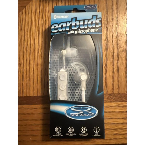 SOLARAY BLUETOOTH EARBUDS GREY & WHITE BUILT IN MIC USB CHARGING PLAYBACK 3.8HRS. Condition is New. Shipped with USPS Ground Advantage.