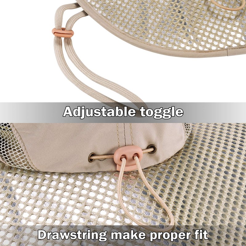- COMFORTABLE & BREATHABLE - Adjustable chin drawstring holds sun hat in place even on windy days. Breathable fabric with mesh panelling on both sides let the breeze through very well, built-in moisture wicking sweatband keep your head cool and comfortable in hot summer.