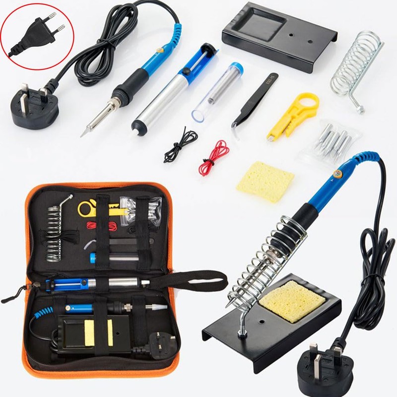 - Product Include: 1*Adjustable temperature soldering iron, 1*Solder wire, 1*Stand, 1*Solder sucker, 5*Soldering iron tips, 1*Tweezer, 1*Iron Tip Cleaner, 1*Tool carry case, 1*User Manual.