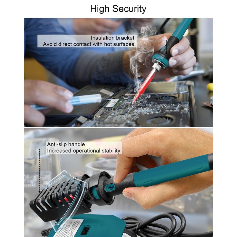 High Safety Standards: The inclusion of a heat-insulated stand and an anti-slip handle design prioritizes user safety. The anti-slip handle enhances stability during high-temperature operations, minimizing the risk of accidental slips. When not in use, placing the soldering iron on the heat-insulated stand prevents direct contact with the hot surface, reducing the risk of burns.