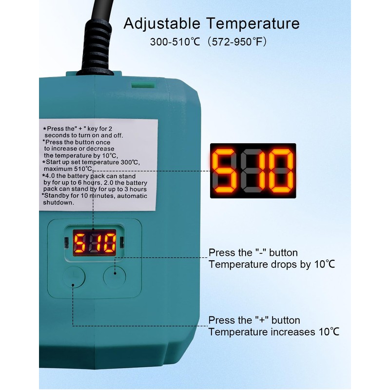 Adjustable Temperature: The soldering kit allows users to adjust the temperature within the range of 300°C to 510°C (572°F to 950°F), catering to diverse welding needs. The temperature adjustment is user-friendly, with a simple press-and-hold mechanism for the "+" and "-" buttons. Additionally, the tool intelligently shuts off after 10 minutes of inactivity, enhancing both safety and energy efficiency.