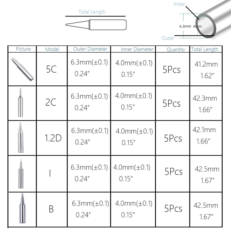 • Soldering tip size: 6.3mm/0.24"(±0.1mm) in outside diameter, the inside diammeter : 4.0mm/0.15"(±0.1mm). The length: 41.2mm/1.62"(±0.2mm)