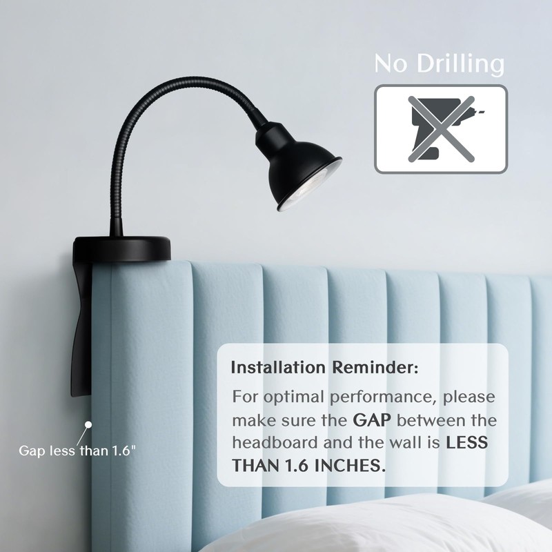 - [ Innovative Design ] Designed with convenience in mind, this is the world’s first no-drill reading lamp for bed over the headboard. Simply fix the light by inserting the support panel into the gap between the wall and the headboard without damaging the wall. Use the provided foam pad to fill in large gaps up to 1.6 inches. *The lamp requires a gap LESS THAN 1.6 inches between the headboard and the wall. NOT suitable for slanted, uneven and hollow headboards.*