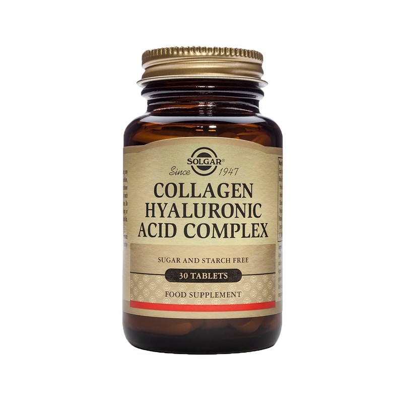 - The vitamin C in Solgar Collagen Hyaluronic Acid Complex Tablets contributes to the protection of cells from oxidative stress which can lead to premature aging.