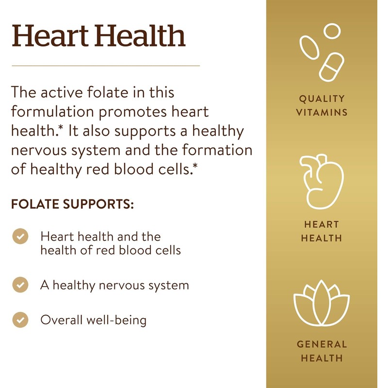 - BENEFITS – The active folate in this formulation helps in promoting heart health as well as providing support for a healthy nervous system as well as the formulation of healthy red blood cells.