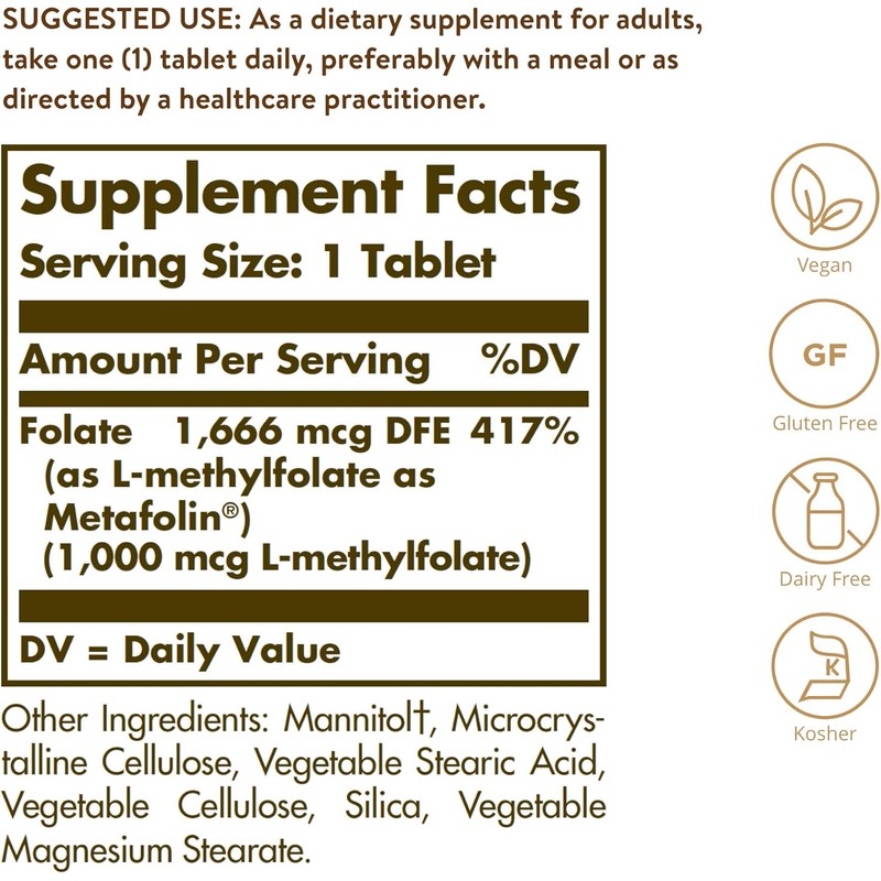 Solgar Folate 1000 mcg, 120 Tablets - 1000 mcg Bio-active Metafolin - Heart Health - Vegan, Gluten Free, Dairy Free, Kosher - 120 Servings