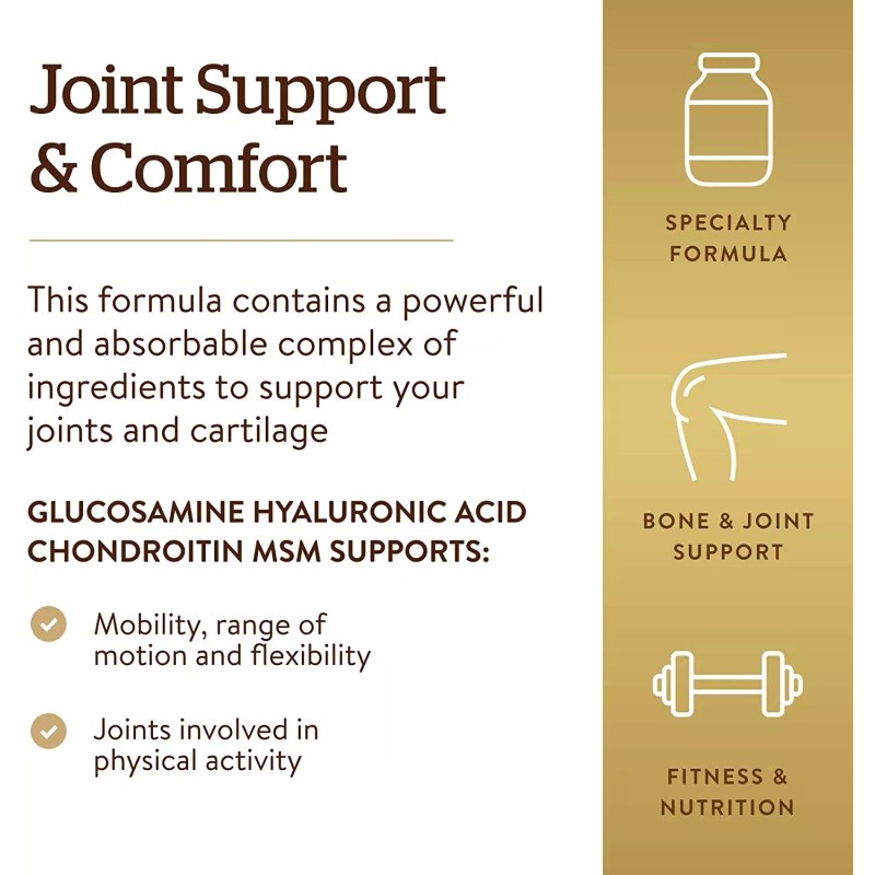 Glucosamine supports mobility, range of motion, and flexibility. It helps ease occasional joint stress due to exercise or physical activity. Chondroitin supports cartilage and joint function. MSM (Methylsulfonylmethane) provides a natural, bioavailable source of sulfur and promotes joint comfort. MSM works synergistically to support the benefits of glucosamine and chondroitin. This formulation also provides Hyaluronic Acid.