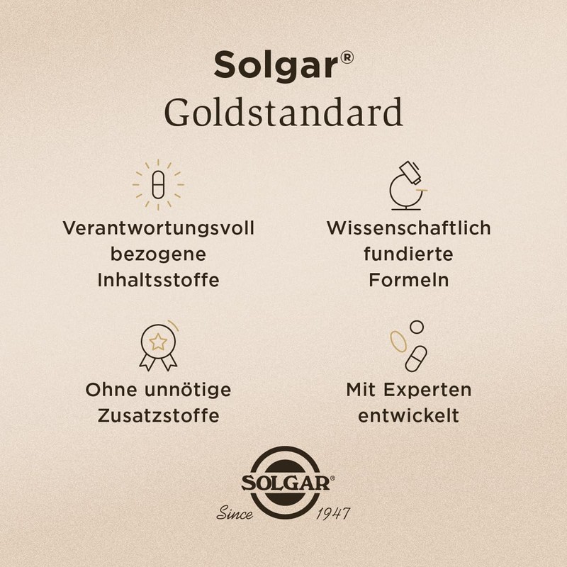 - 75 years of experience: SOLGAR - the "gold standard" for vitamins and dietary supplements since 1947. Highest quality thanks to high-quality, natural raw materials and the use of 100% recyclable medical brown glass. For a life in balance.