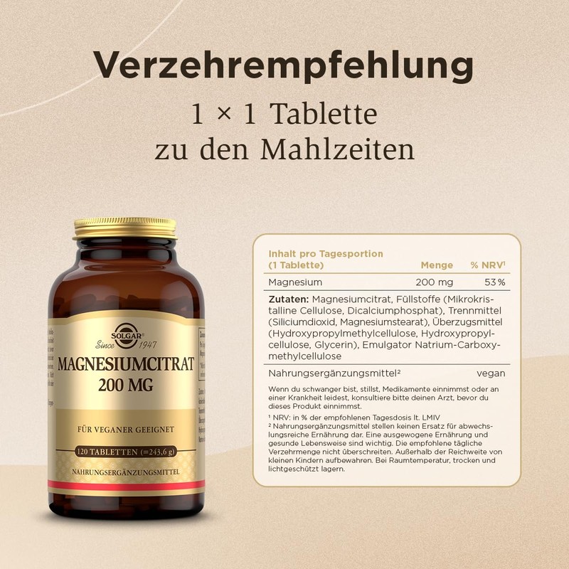 SOLGAR® Magnesium Citrate 200 mg | For Energy, Psyche & Muscles | High Bioavailability | 120 Vegan Tablets