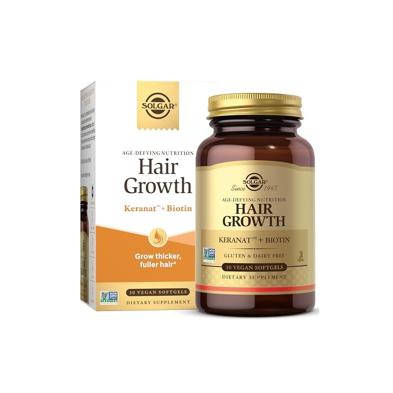 Solgar's Age-Defying Hair Growth has been uniquely formulated to support beautiful hair*. Featuring Keranat?, a patented and clinically studied ingredient shown to significantly slow hair loss, reduce scalp dryness and promotes healthier, shinier and more lustrous hair during 12 weeks of continuous use, improve the hair growth cycle and help support the growth of thicker, fuller hair*. Just one softgel per day also delivers 100% the Daily Value of Biotin. *These statements have not been evaluated by the Food and Drug Administration. This product is not intended to diagnose, treat, cure or prevent any disease