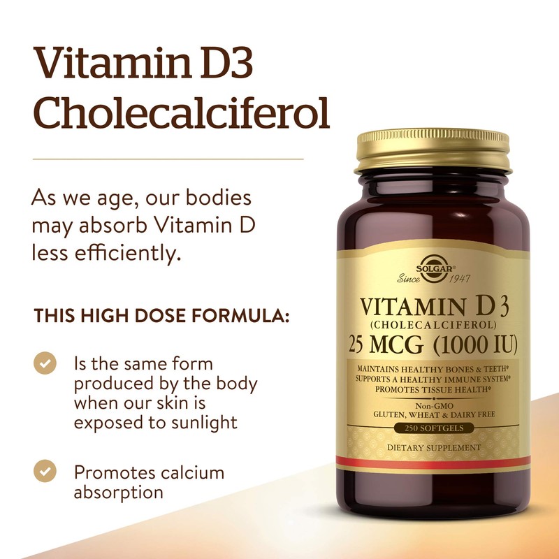 - Support Your Immune System; Solgar Vitamin D3 (Cholecalciferol) 25mcg (1000 IU) Softgels support a healthy immune system and neuromuscular function