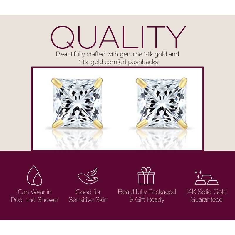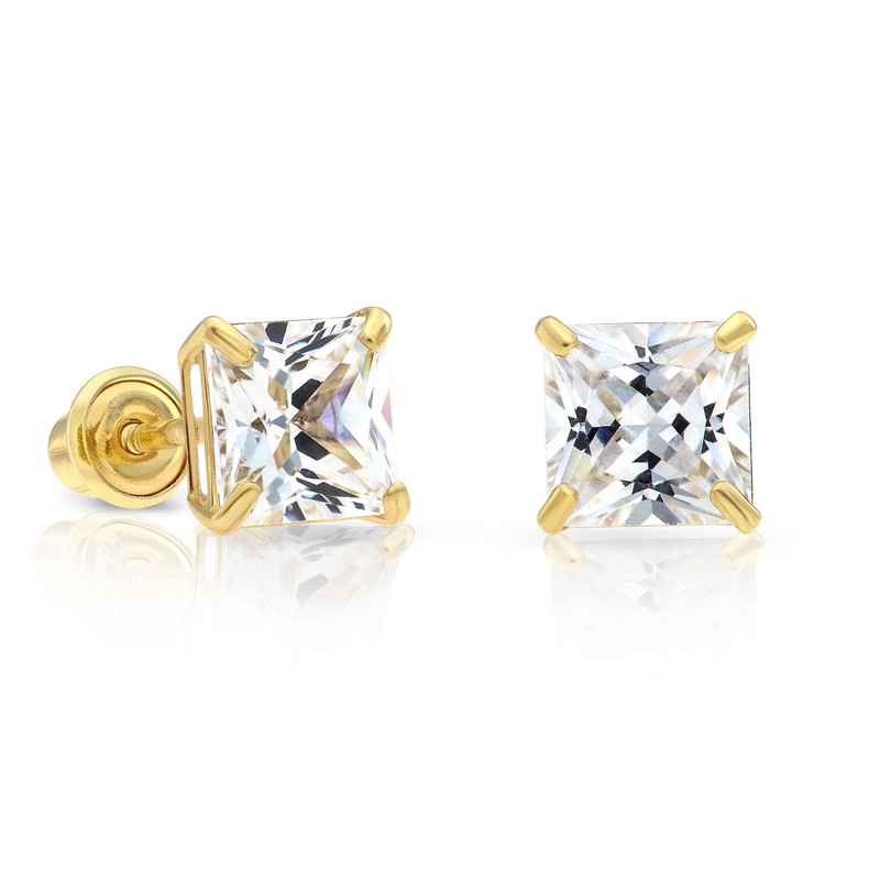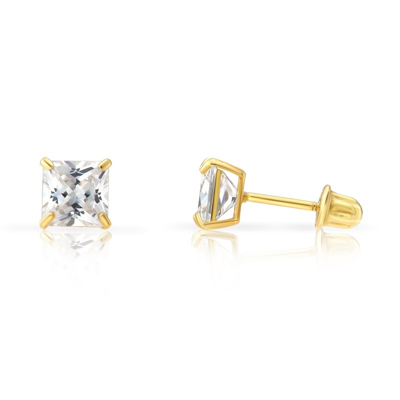 Solid 14k Yellow Gold Solitaire Square Princess-cut CZ Stud Earrings with Secure Screw-backs (5mm)