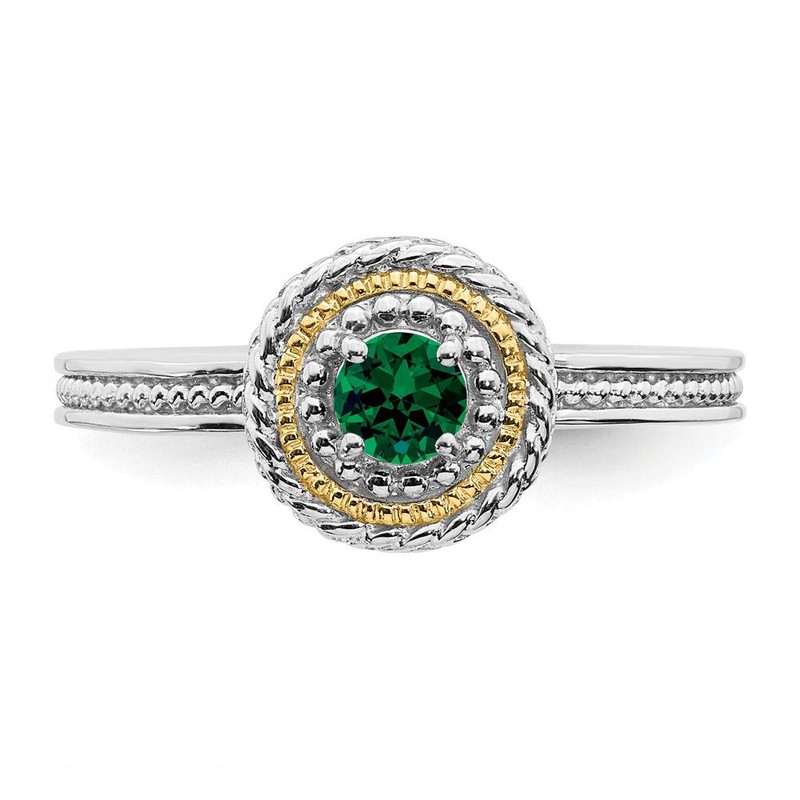Solid 925 Sterling Silver and 14k Yellow Gold Stackable Created Emerald Green May Gemstone Ring Eternity Band Size 7
