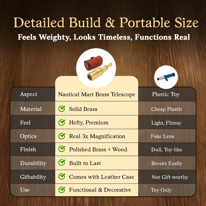 - ⭐ FULLY FUNCTIONAL, STURDY & DURABLE : Genuine solid Brass, genuine functional Glass Optics, good protective Leather Case. That’s a spyglass that will resist all your adventures !
