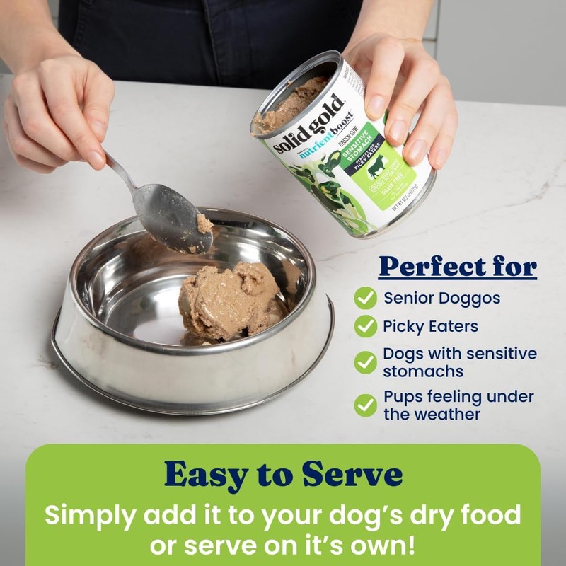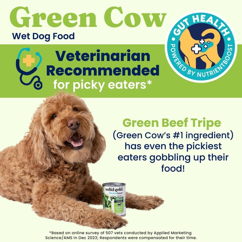 - Make Other Dogs "Green" with Envy! - Solid Gold Green Cow is a yummy wet dog food made with fine-tuned levels of protein, vitamins, antioxidants, fiber, and omega 3 fatty acids for sensitive tummies.