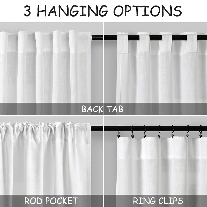 - READY MADE: 2 White Linen Curtain Panels per package.Each panel measures 52 inches wide by 96 inches long. Top design of Back tab & loop pocket provide 3 hanging options. <1> hanging from the back patch to create an elegant pleated look, <2> from the 3 inch rod pocket for a classic look <3> Hanging with clip rings for easy, slide open and closed (clip rings are not included)