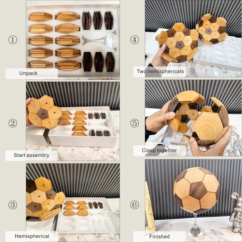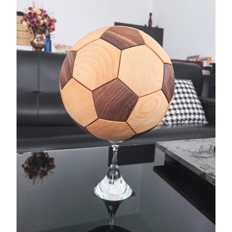 - CHALLENGE DIY SKILLS:The diameter of the wooden soccer ball is 220mm. It consists of 32 pieces of wood Luban lock mortise and tenon parts. It is composed of 32 pieces of wood Luban lock mortise and tenon parts, including 12 pentagonal components; Unilateral slot hexagon 10 pieces; Bilateral slot hexagon 10 pieces, need to pay attention to the assembly of each semicircle when the direction of the slot should be consistent. The slots of the two semicircles should be fastened together in opposite directions. It is the best choice for those who like to make things with their hands