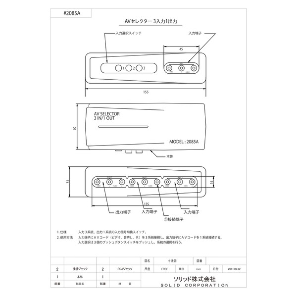 ■ A product that uses a button switch to select a signal connected to the input terminal of 1 to 3 and then output it. There is no function to choose only video and audio to output output.