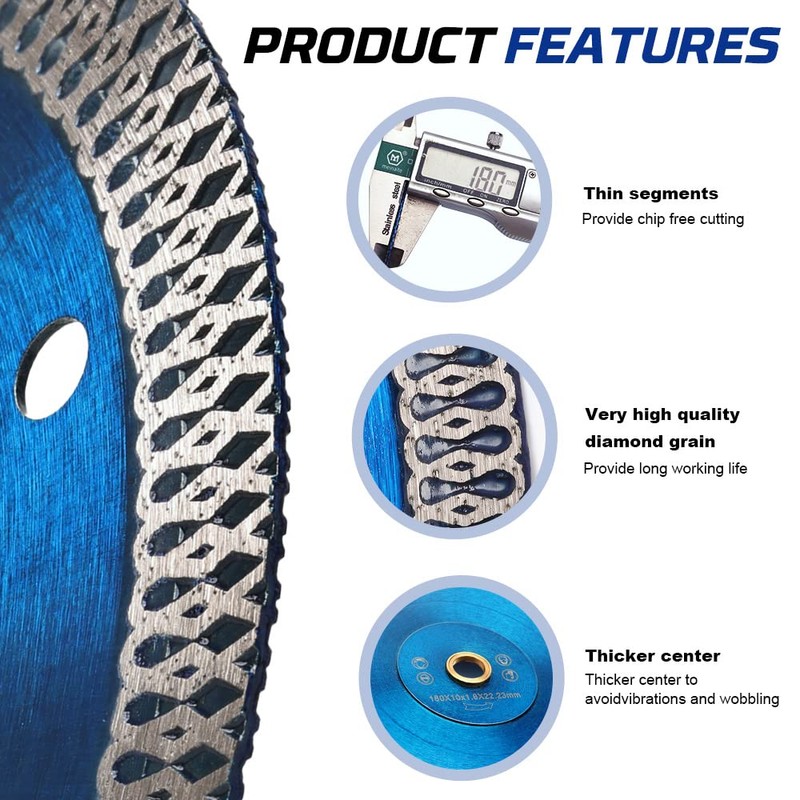 - 180mm Turbo Diamond cutting Discs that Make Process of Cutting Through Tough Materials Super Easy; Recommended for Cutting and Finishing of Granite, Marble, Concrete, Ceramics, Stones, Tiles, Soft & Common Construction Materials