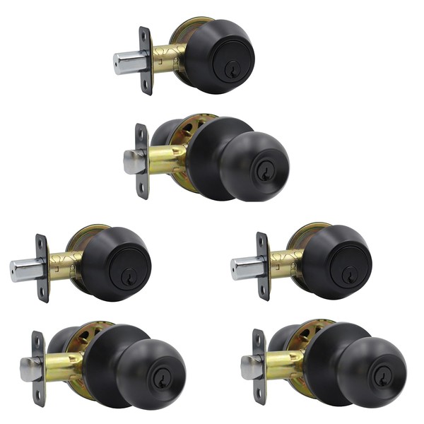 Solidware Entry Door Knob and Single Cylinder Deadbolt Combo, Keyed Alike Combination Sets Door Locksets, Matte Black Front Door Knobs and Deadbolt Set (3 Pack)