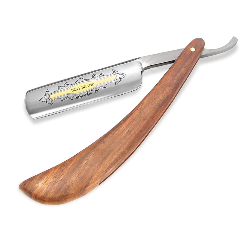 - Razor with classic gold etching and wooden handles and 5.8 inch blade made of carbon steel