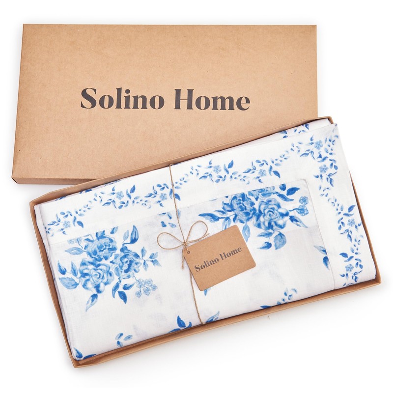 Solino Home Blue Spring Floral Table Runner 48 inch - 100% Pure Linen Table Runner 14 x 48 Inch for Easter, Mothers Day, Summer - Handcrafted and Machine Washable - Jolie Fleur Print