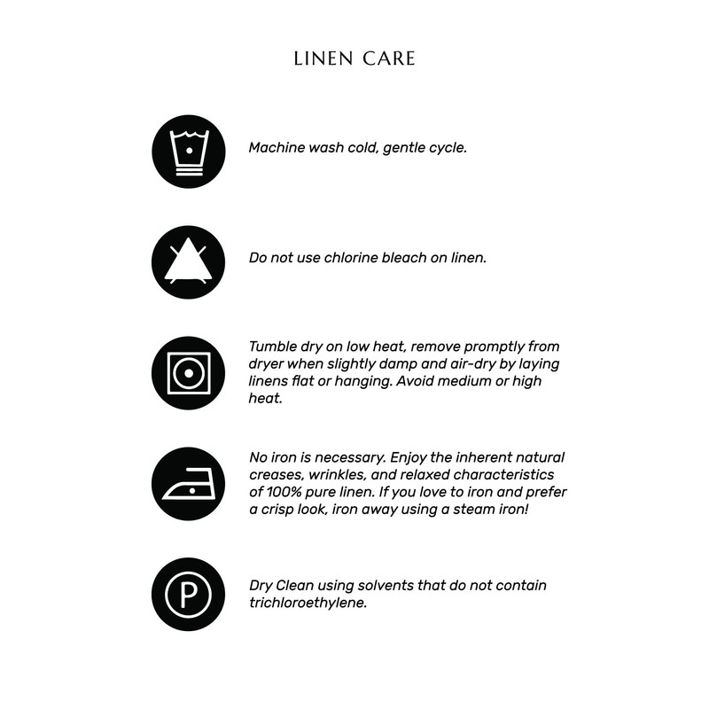 - Easy Care - Machine Washable, Low Iron as Needed, Steam Iron for a crisp look. The beauty of each pure linen piece is the natural fibers and classic aesthetic that mellows with each washing, betters with age and requires minimal care