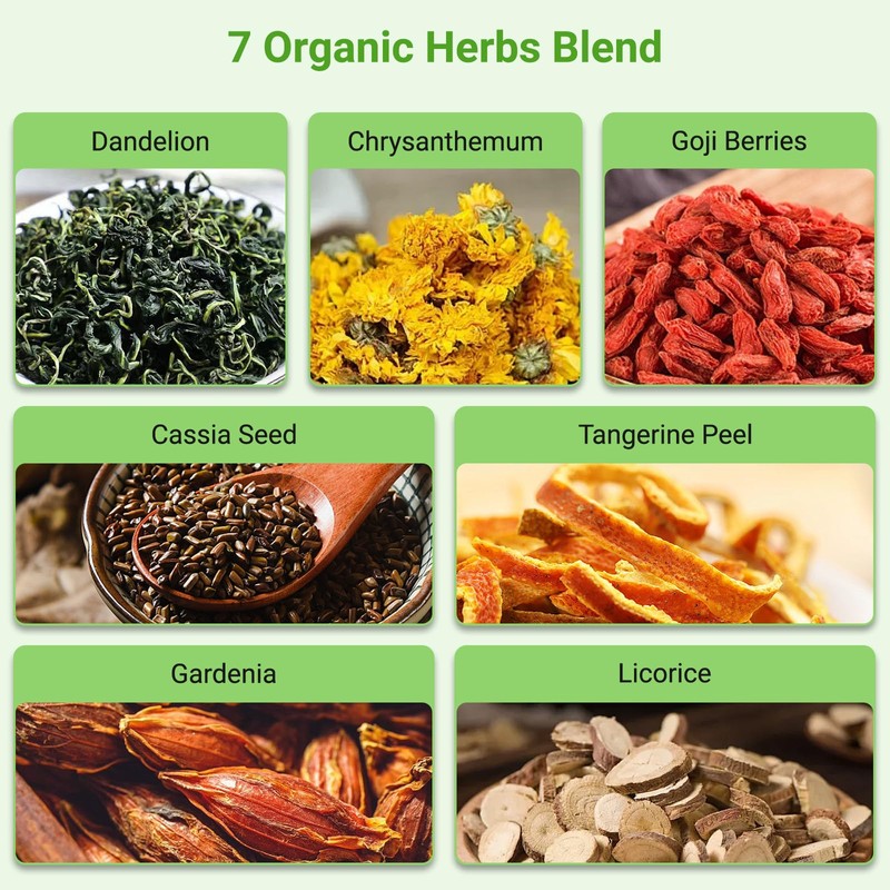 - 7 PURE NATURAL FORMULA: Crafted from carefully selected premium materials including dandelion, chrysanthemum, wolfberries, cassia seeds, orange peel, gardenia, and licorice. It is formulated through multiple and repeated proportioning to more effectively nourish and safeguard your liver and kidney