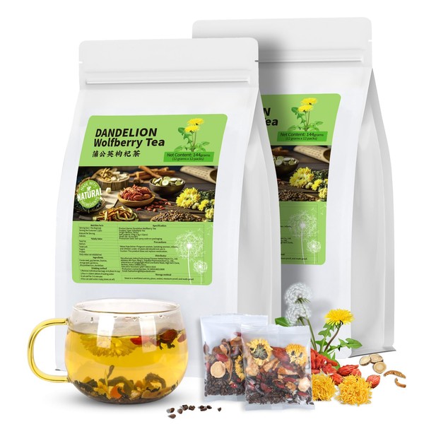 Our Dandelion wolfBerry Tea is scientifically formulated with dandelion, chrysanthemum, wolfberries, tangerine peel, cassia seeds, gardenia and liquorice. These ingredients work in synergy to help nourish the liver and kidneys, clear heat and toxins, boost immunity, soothe the liver and improve eyesight, relieve fatigue and promote intestinal peristalsis100% NATURAL NO OTHER INGREDIENTS ADDED: Our dandelion root tea all plant and grow naturally. The premium fruits are handpicked and carefully selected before being processed. it is no additives, is free from chemical drug contamination, and has no chemical odors or artificial colorsORGANIC AND PURE: No Sugar, No Artificial Color, No Caffeine, Original FlavorHOW TO USE: 1 Bag Per Day. it is prohibited to drink this tea on an empty stomach in the morning. We recommend that you wait for half an hour after a meal before drinking itSTORAGE RECOMMENDATIONS: Store our Dandelion Wolfberry Tea bags in a dry, ventilated, and dark place. For summer storage, you may refrigerate them, but never store opened tea bags alongside strong-smelling items (e.g., spices, coffee) to prevent odor absorption