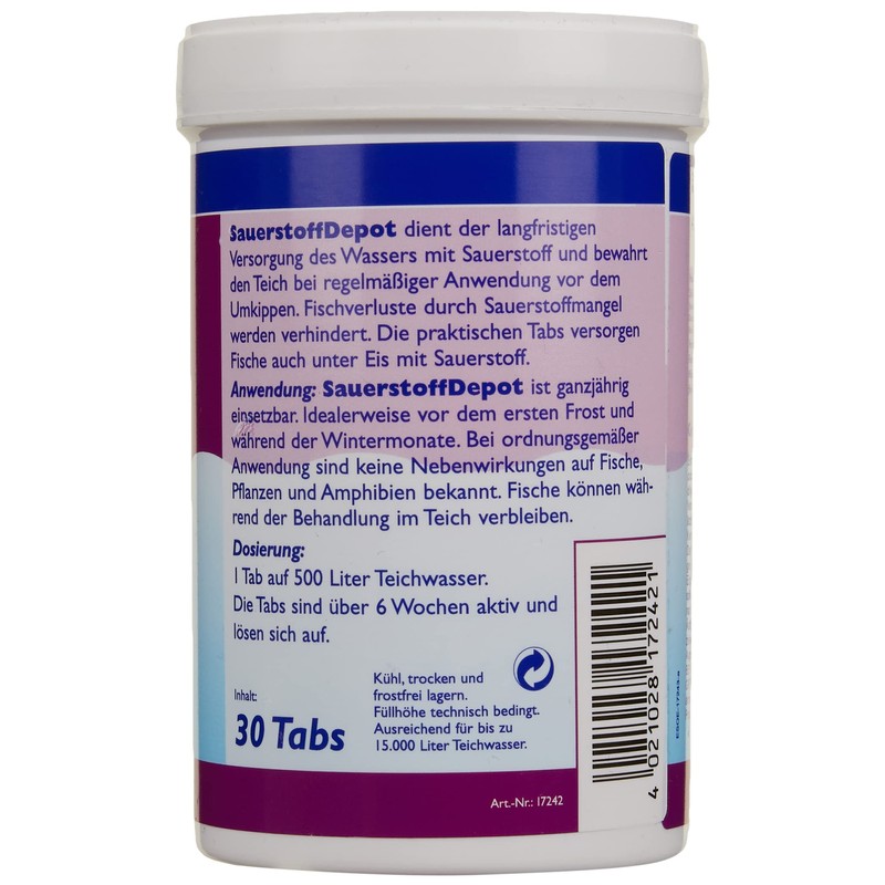 - Oxygen supply in tablet form: the practical active oxygen tabs provide pond water, fish populations and bacteria all year round, even in winter and under ice for 6 weeks
