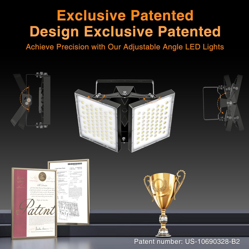 - Wide Adjustable Lighting & IP66 Waterproof: Enjoy customizable lighting with 3 adjustable lamp heads and a patented bracket design. With 180° vertical and 330° horizontal adjustments, and a 330° wide beam angle, it delivers expansive, shadow-free illumination for any setting. Constructed from rugged die-cast aluminum and impact-resistant PC materials, it boasts an IP66 waterproof rating, making it perfect for courtyards, garages, parking lots, sports fields, and driveways.