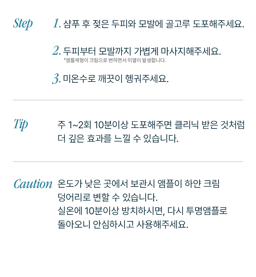 | 사용할 때 주의사항 | 1. 화장품 사용 시 또는 사용 후 직사광선에 의하여 사용부위가 붉은 반점, 부어오름 또는 가려움증 등의 이상 증상이나 부작용이 있는 경우 전문의 등과 상담할 것 2. 상처가 있는 부위 등에는 사용을 자제할 것 3. 보관 및 취급시의 주의사항 가. 어린이의 손이 닿지 않는 곳에 보관할 것 나. 직사광선을 피해서 보관할 것 4. 눈에 들어갔을 때 즉시 씻어낼 것 5. 사용 후 물로 씻어내지 않으면 탈모 또는 탈색의 원인이 될 수 있으므로 주의할 것 |