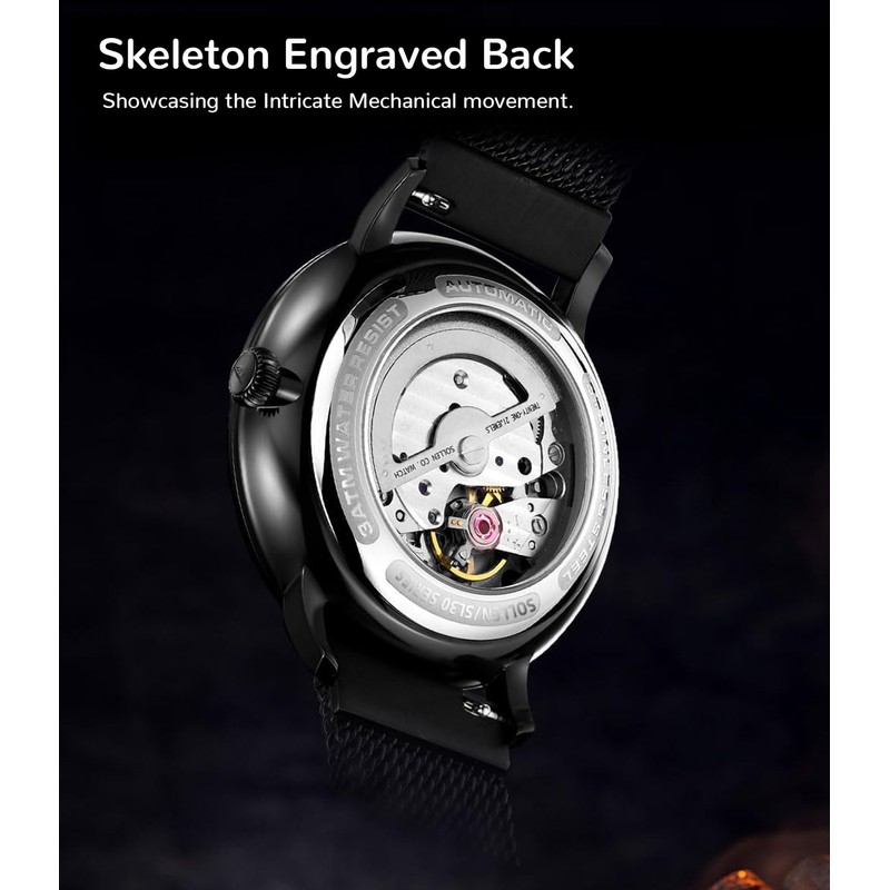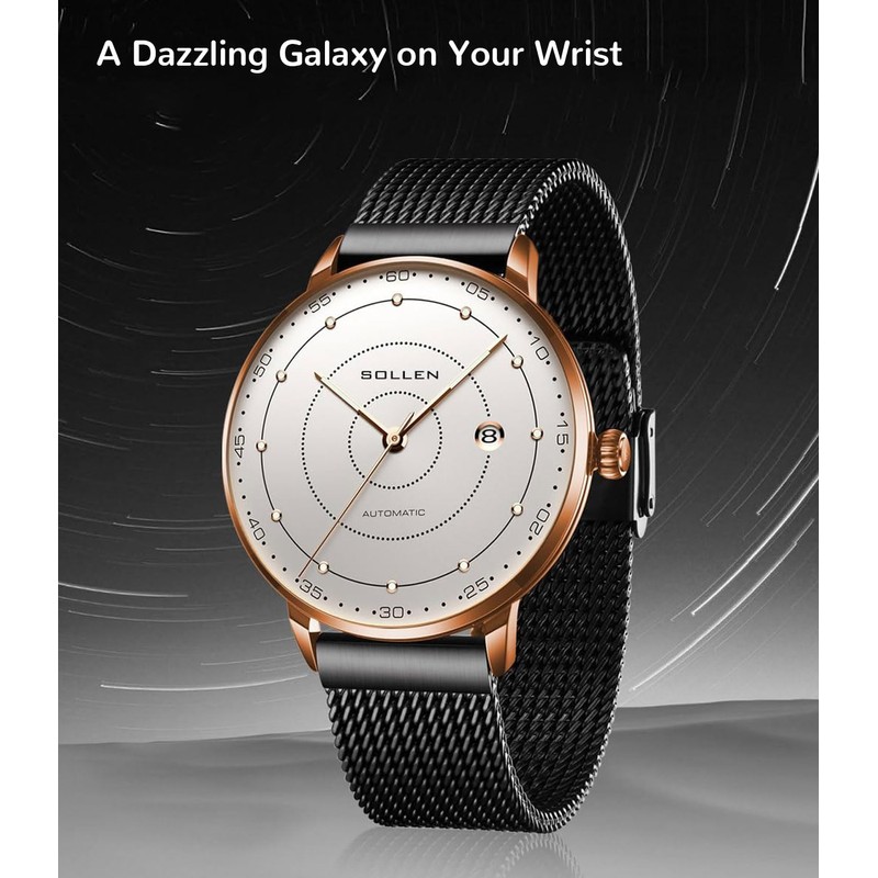 - SOLLEN Automatic Mens Watch: Inspired by Star Trek, this luxury automatic mechanical watch features a white dial and black strap for a futuristic look. Each Arabic numeral is adorned with a gold planet connected by an orbit, simulating the galaxy and adding a striking sci-fi element.