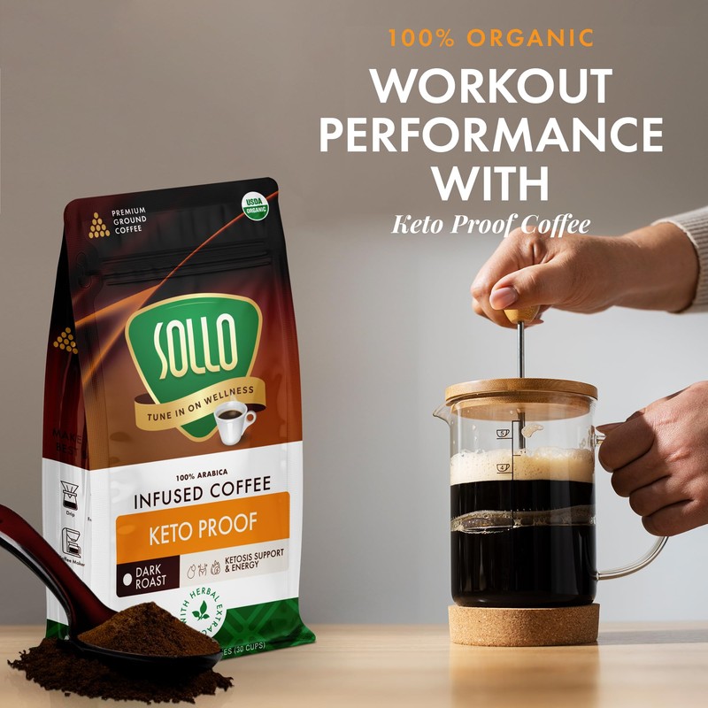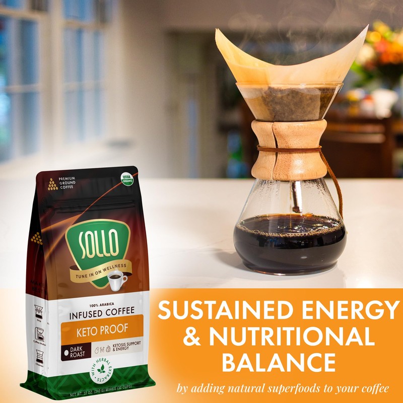 Sollo Keto Proof Organic Ground Coffee - Infused Blend, Dark Roast, Bold & Smooth Taste, 100% Arabica Specialty Grounds, 12 oz