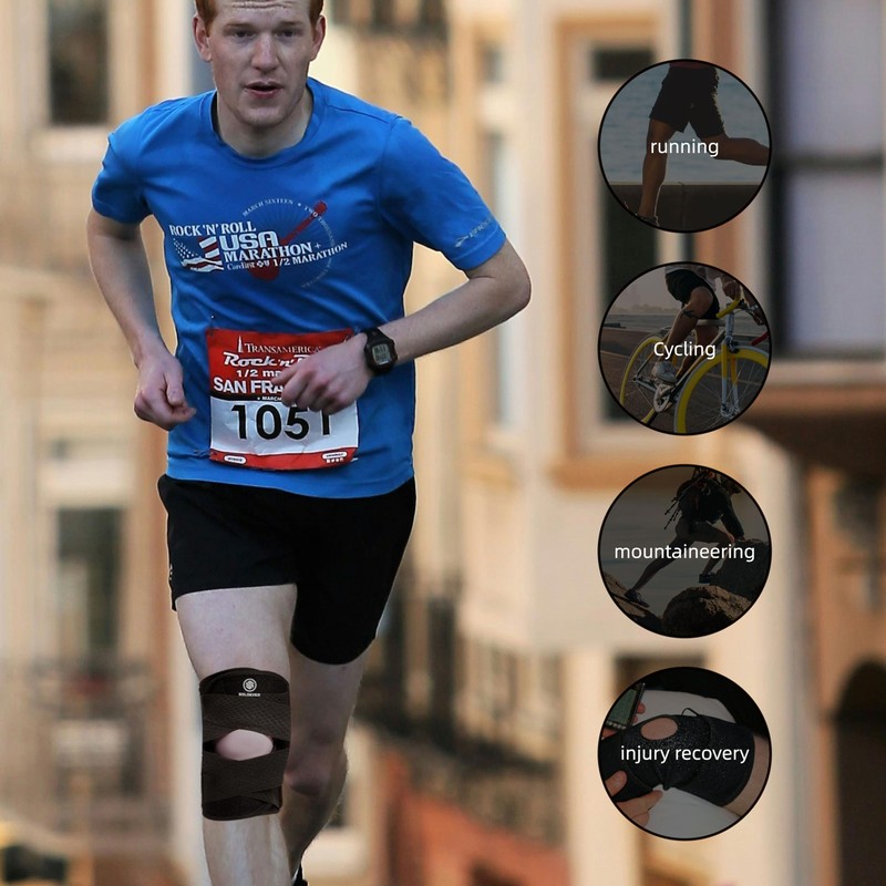 - 【Ergonomic design】The design of the knee support braces with side stabilizers takes human anatomy into account, with its curves perfectly matching the natural shape of your leg, snugly fitting around your knee contour to provide a comfortable embrace that reduces pain. The open patella design at the center offers a breathable space, minimizing the friction against the meniscus and ensuring your knee moves freely and without constraints.