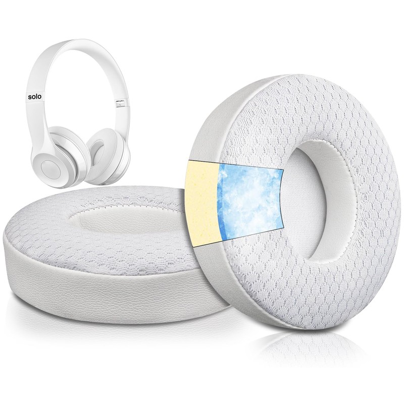 SoloWIT Cooling Gel Replacement Ear Pads Cushions for Beats Solo 2 & Solo 3 Wireless On-Ear Headphones, Earpads with High-Density Noise Isolation Foam, Added Thickness - White
