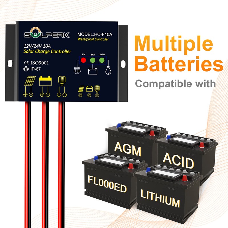 - ✔️【Waterproof Solar Charge Controller】IP67 waterproof, suitable for outdoor use. Automatically identify voltage, 12V Max power: 150W, 24V Max power: 300W. The maximum current is 10A. Compatible with various 12V/24V deep-cycle batteries, such as AGM, GEL, Flooded. Adopting brand MCU chips to realize fast intelligent control and ultra-low standby power consumption.