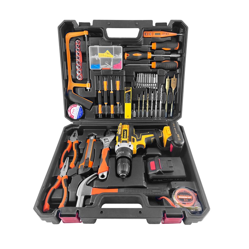 SOLUDE Tool Set with Drill,21V Cordless Power Drill Tool Box with 2 Battery,Electric Drill Driver with Basic Hand Tools for Home Repair and DIY Projects
