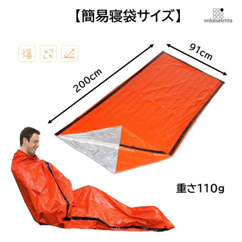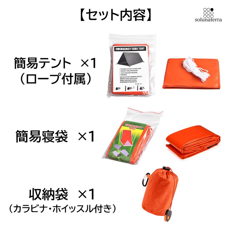 It can be used as a preparedness during mountain climbing, or in case of disasters. The simple tent is designed to prevent the cold and waterproof, and heat preservation effect to reduce body temperature during an encounter, while the orange color (international rescue color) increases visibility and is easy to be found during rescues. It is also effective when camping to prevent unexpected cold weather. This set includes a simple sleeping bag, so you can increase the heat retention. Lightweight and compact when stored, it is sized in the palm of your hand, so please prepare one set in a corner of your climbing backpack or in a disaster preparedness bag. High quality polyethylene material with heat reflection, waterproof and abrasion resistant coating that resists tears and punctures. Contents: Simple tent x 1, rope x 1, simple sleeping bag x 1, storage bag x 1, total weight: approx. 12.8 oz (350 g).
