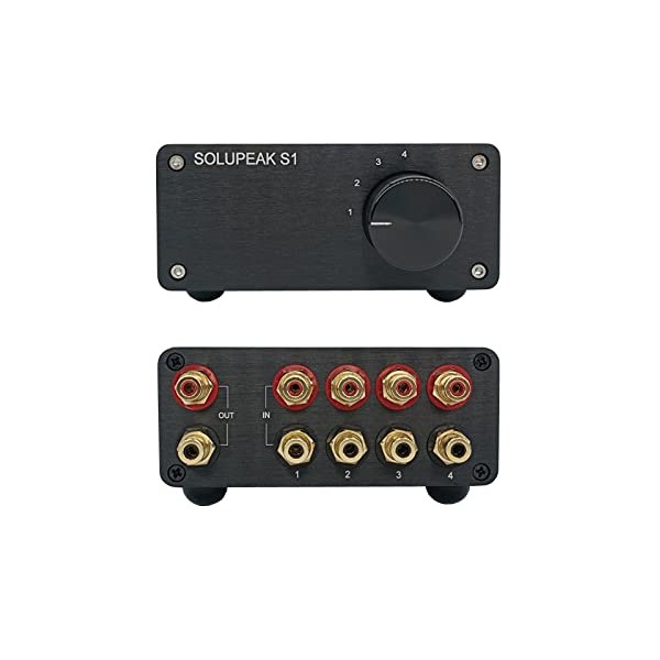 - This compact switcher box allows connection of up to 4 stereo sources input and selects 1 audio output through the rotary knob (Note: when 1-in 4-out: 4 outputs are not simultaneously)
