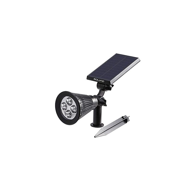 **Product Description:** Solar technology has advanced and is now a must-own solution for outdoors home and landscape lighting. This beautiful solar spotlight offers ultra bright lighting for homes and gardens and can be installed via ground stake or on walls, decks, fences, pathways, etc. The solar panel absorbs sunlight and converts it to energy during the day, allowing the automatic on/off switch to activate at night and provide lovely uplighting. The IP65 waterproof, weatherproof, durable build allows for year-round use in any condition.