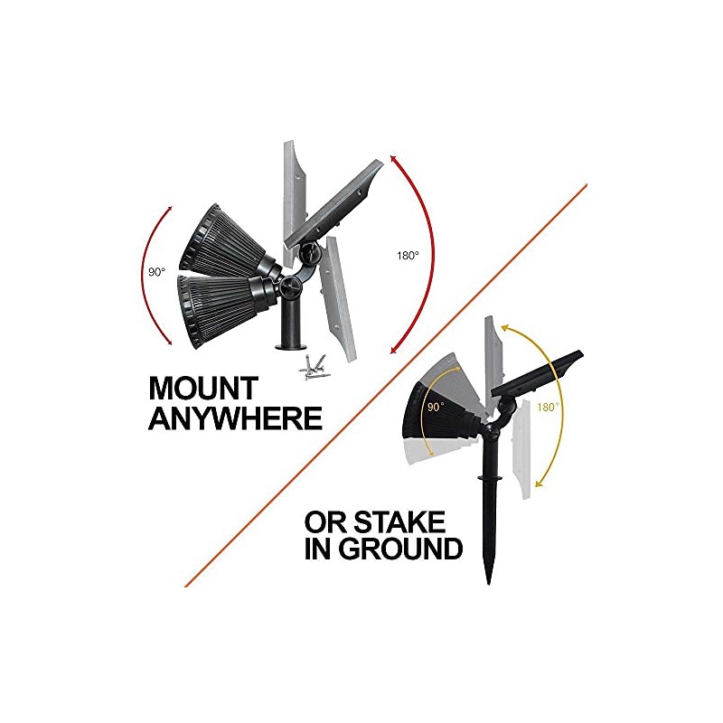 * 2 modes - high light mode & dim light mode * No wiring or batteries required - simply stick in ground or mount on wall and enjoy * Great sleek black floodlight for decorative tree, lawn, deck, patio, pool, path dock and more * Solar-Powered, Low Voltage, Stake or Hang, Automatic * Adjusted 270 degrees up or down (180 degrees for the panel, 90 degrees for light head) * All-weather resistant- you can leave these out all year long