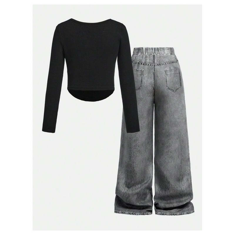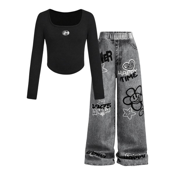 SOLY HUX Girl's 2 Piece Outfits Graphic Print Long Sleeve Tee Tops and Jean Pants Streetwear Set Black Letter 11Y