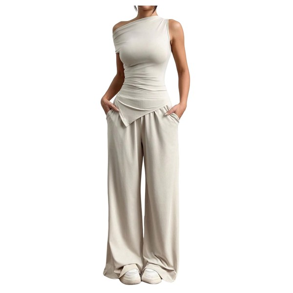 SOLY HUX Women's 2 Piece Outfits Lounge Sets Off The Shoulder Tops Wide Leg Pants Summer Casual Matching Set Solid Apricot Large
