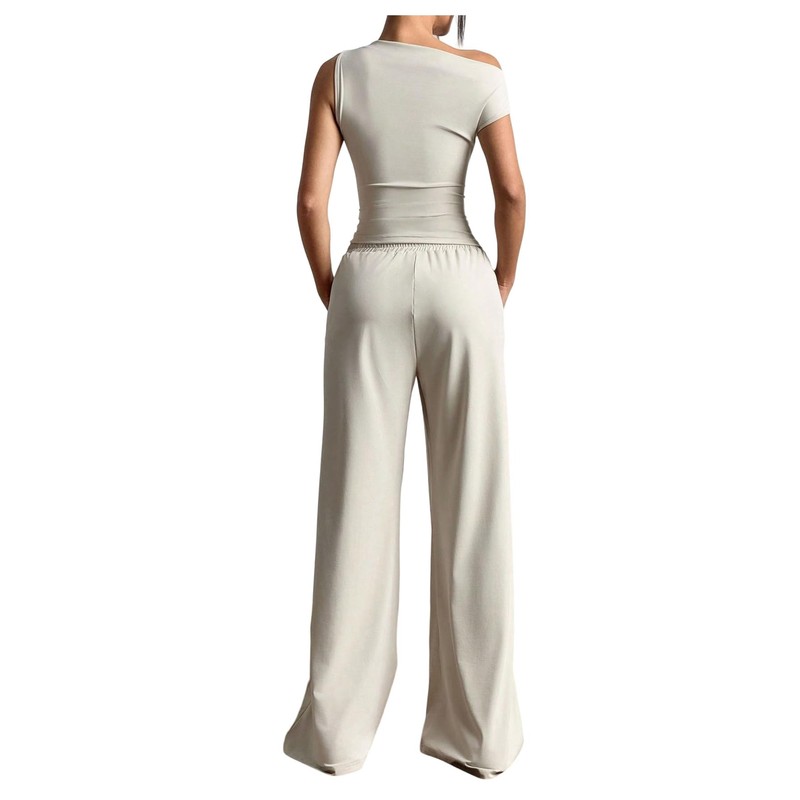 - Features: Off the shoulder, ruched, sleeveless, high waisted, adjustable drawstring, side pockets, easy pull-on design, wide leg, Elasticated comfort fabric - perfect for daily wear.