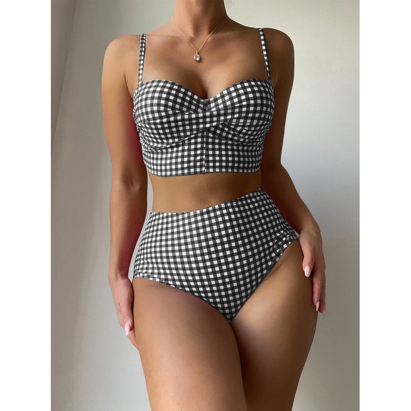 - Feature: Spaghetti strap, twist front, plaid, high waisted bikini bottom, womens swimsuits, fashionable