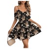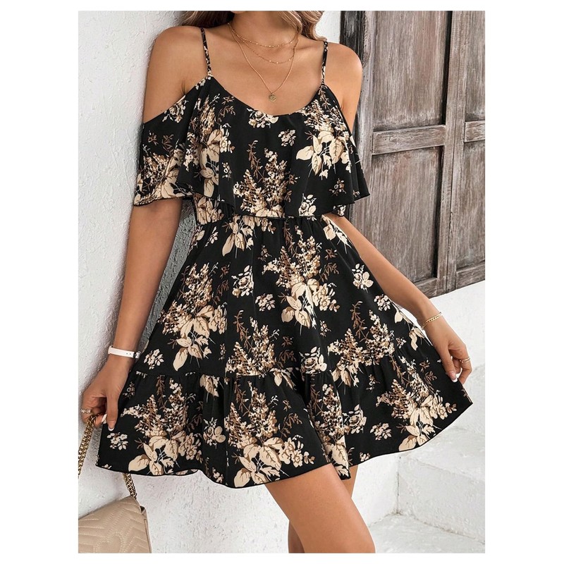 SOLY HUX Women's Boho Floral Print Cold Shoulder Dress Short Sleeve Ruffle A Line Vacation Elegant Mini Dresses Black Large