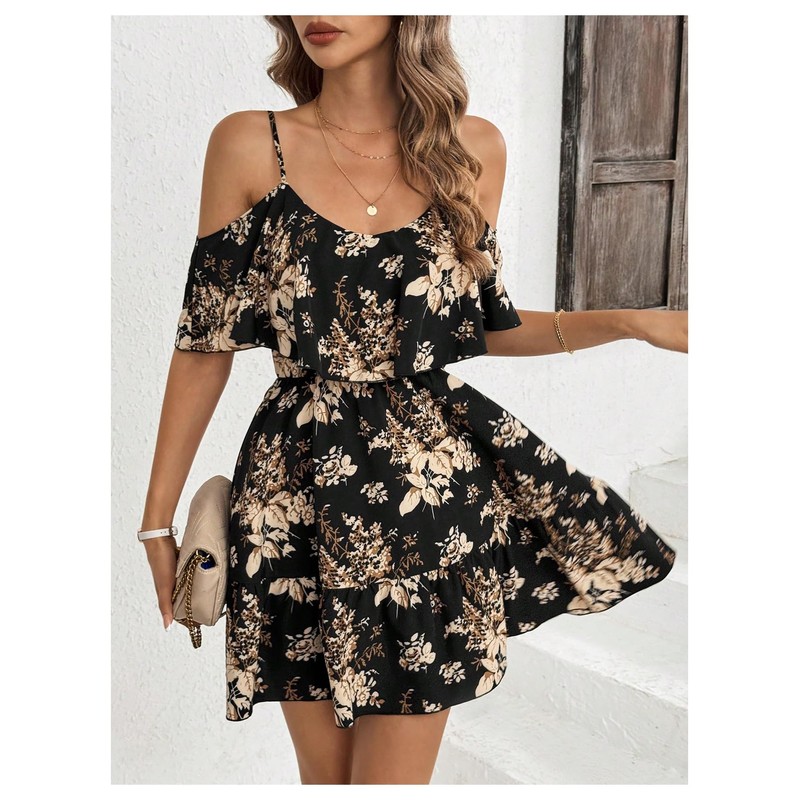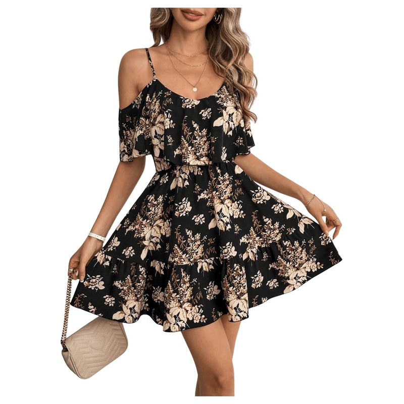- Features: Flower pattern, spaghetti strap, flared a line, ruffle hem, cut out shoulder, short dress, flowy dresses