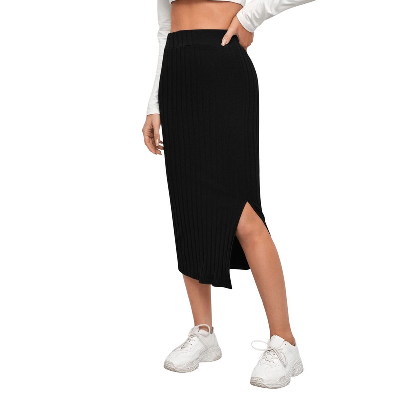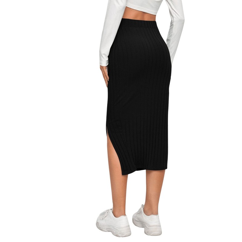 - Elastic waistband ribbed knit pencil skirt with slit