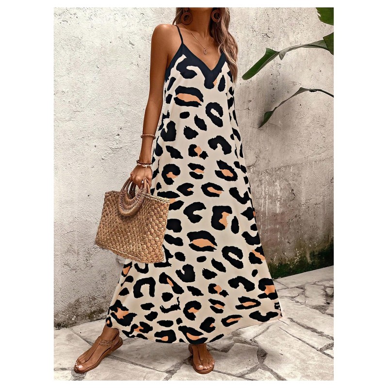 - Feature: Leopard print, v neck, spaghetti strap, sleeveless, flared hem, summer cami dress, womens dresses, long maxi length, loose fit, fashionable